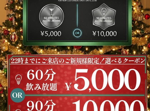 ★ご新規様限定★特別価格☆選べるクーポン 22時までのご来店で 【60分¥5,000で飲み放題🍸】or【90分¥10,0...